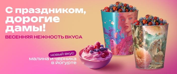 Специально для вас мы создали новый вкус: попкорн «Малина и черника с йогуртом». Он такой же нежный, какими мы вас знаем, и такой же яркий, как ваши улыбки.