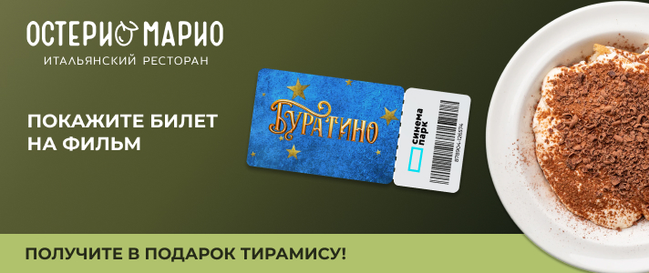 С 5 января по 2 февраля смотрите сказку «Буратино» в «Синема Парк Аура» и получайте десерт тирамису в подарок в ресторане Остерия Марио.