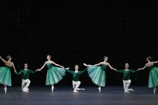 Хореографическая симфония в трех частях в постановке Джорджа БаланчинаТри драгоценных камня, три эпохи, три композитора, три стиля костюмов и три школы танца: «Драгоценности» Джорджа Баланчина то ли оживляют камни, то ли делают ускользающую красоту движения материальной.Что прекраснее: сияние и огранка драгоценных камней или блеск и изящество классического танца? Знаменитый балет Баланчина демонстрирует, что у совершенных ювелирных изделий и не менее совершенных балетных па много общего.История о драгоценных камнях, послуживших прообразом для трех одноактных балетов, конечно, лишь красивая «обёртка». На самом деле три действия спектакля посвящены трем великим балетным школам, оказавшим в свое время влияние на становление Баланчина как танцовщика и хореографа. Первая часть, «Изумруды», на музыку Габриэля Форе – посвящение французской школе, изысканной и элегантной. Вторая часть, яркие, джазовые «Рубины» на музыку Стравинского – оммаж американской школе танца. И, наконец, «Бриллианты», белый балет с безупречными кордебалетными построениями, классическим белым адажио и бравурным финалом, конечно же, на музыку Чайковского – подарок и поклонение великой русской школе классического балета с ее кристальной чистотой и императорским блеском.