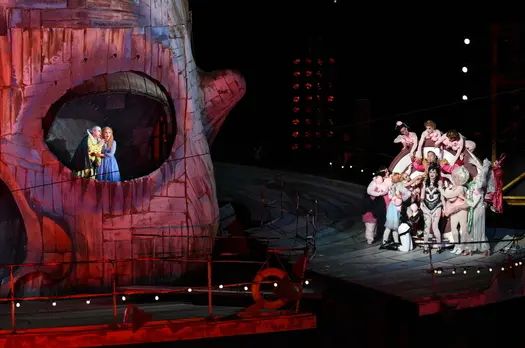 Захватывающий, кровавый шедевр Джузеппе Верди, полный невероятно красивой музыки, исполняется на плавучей сцене Брегенца впервые. Постановка оперы Риголетто на озерной сцене - воплощение давней мечты режиссера Филиппа Штёльцля, известного в России в основном своими работами в кино (Гете!, Лекарь: ученик Авиценны), а также музыкальными клипами группы Rammstein. У оперного фестиваля в Брегенце есть особенный повод для гордости – знаменитая плавучая сцена на Боденском озере. Режиссёр Филипп Штёльцль давно мечтал поставить спектакль именно здесь – с “Риголетто” Верди его мечта наконец осуществилась. Героев своей постановки он заставляет блуждать на фоне гигантской головы шута – ее пышная гротескность контрастирует с камерным характером драмы, которая разворачивается между шутом Риголетто , его невинной дочерью Джильдой и обольстительным герцогом Мантуанским. Заглавную партию в этом зрелищном и ярком спектакле исполняет российский бас Владимир Стоянов.